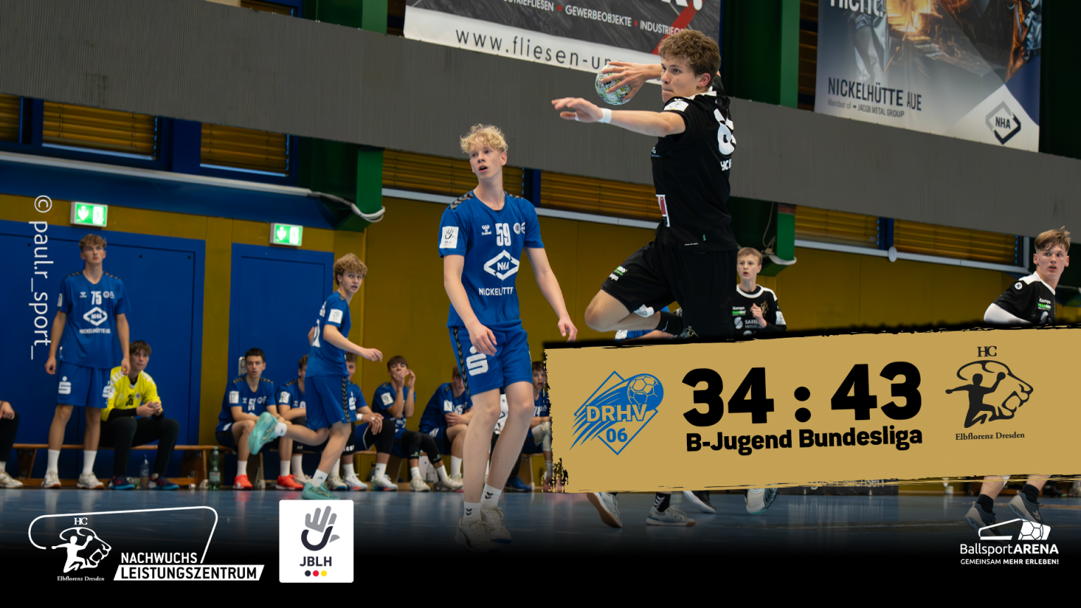 Die B-Jugend des HC Elbflorenz zeigte in Dessau eine rundum überzeugende Vorstellung und feierte mit dem 43:34 (22:17) Auswärtssieg ihren bislang konstantesten Auftritt der laufenden Saison. Von Beginn an präsentierten sich die Dresdner konzentriert, aggressiv in der Zusammenarbeit der Deckung und mit klaren Lösungen im Angriff – auch, wenn Dessau phasenweise auf eine Manndeckung umstellte. Nach einem ausgeglichenen Start (6:6, 10. Minute) übernahmen die Gäste Schritt für Schritt die Kontrolle. Mit guter Abstimmung in der Defensive und konsequenten Hilfen gelang es, Dessaus Rückraum gut zu kontrollieren. Vorne fanden die Dresdner immer wieder Lücken, spielten geduldig und erzielten aus nahezu jeder Position Treffer. Ein 4:0-Lauf Mitte der ersten Halbzeit sorgte erstmals für eine etwas klarere Führung (7:11). Über 13:17 und 15:19 setzten sich die Tiger bis zur Pause auf 17:22 ab.